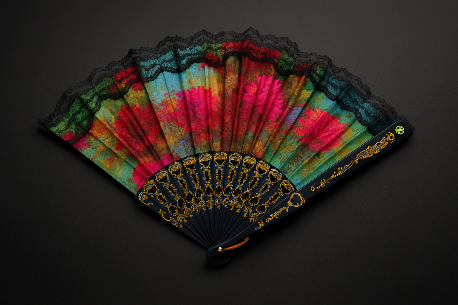 Captures the wild spirit of nature meeting light. Its radiant floral pattern glows like a sunset through trees, contrasted by deep shadows and gold detailing. Each wave of this fan reveals a new hue a living canvas designed for expression, rhythm, and movement.