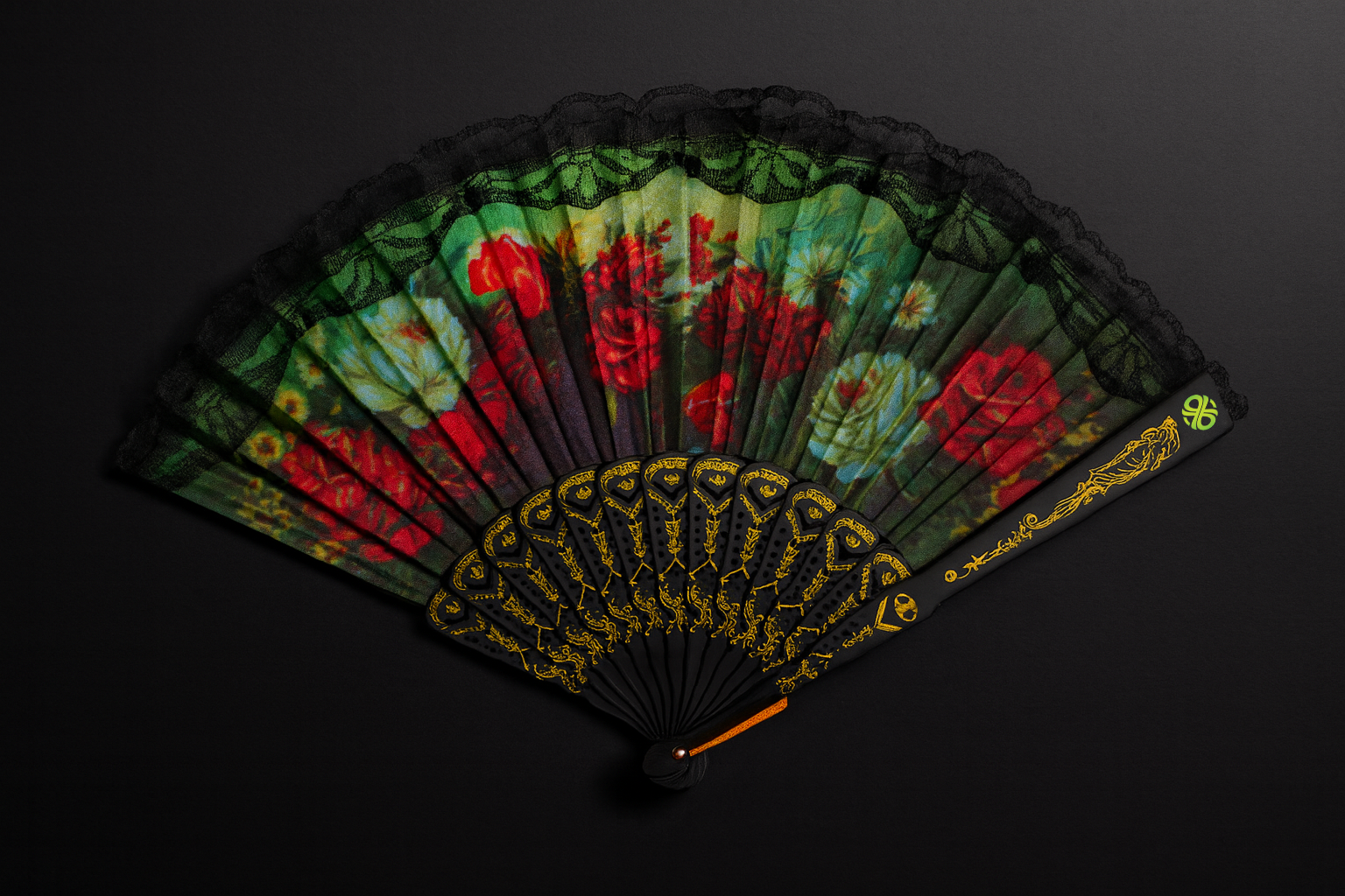 Step into the Midnight Garden, where color breathes through darkness. Red and green florals bloom under a soft black lace trim, contrasted by intricate golden detailing a blend of nature’s romance and rave sophistication. Lightweight yet dramatic, this fan turns every gesture into art. Designed for nights that never end and moments that leave a mark.