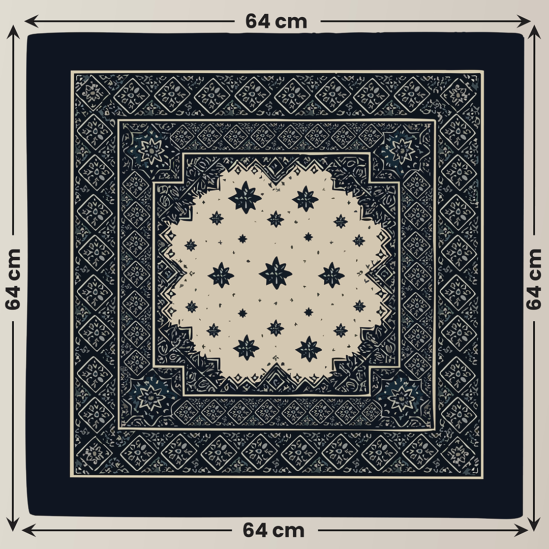 This isn't just a pattern; it's your personal anthem. A bold, 64x64 cm mosaic of stars and symbols in deep navy and white, all rendered on a smooth, lustrous satin fabric. It's a timeless classic, redefined for a new, unapologetic attitude. Wear it as your signature. Wear it as your statement. This is your style, your song.