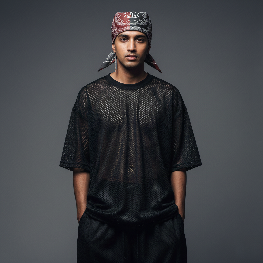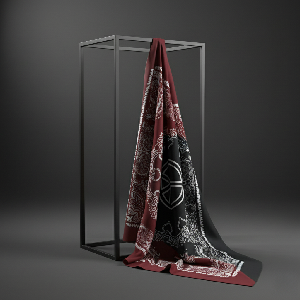 Crafted from a brilliantly smooth satin fabric, this scarf gives a premium feel to a rebellious print. The 64x64 cm design features a powerful red-and-black split, letting the peace, heart, and paisley motifs shine with a subtle luster. Versatile and iconic-wear it as a head wrap, neck scarf, or a pop of attitude on your bag.